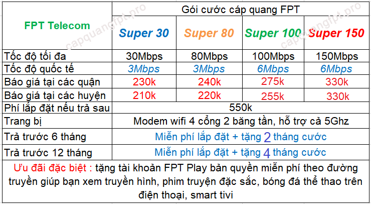 Lưu ý: giá cước có thể thay đổi tuỳ theo khu vực lắp đặt