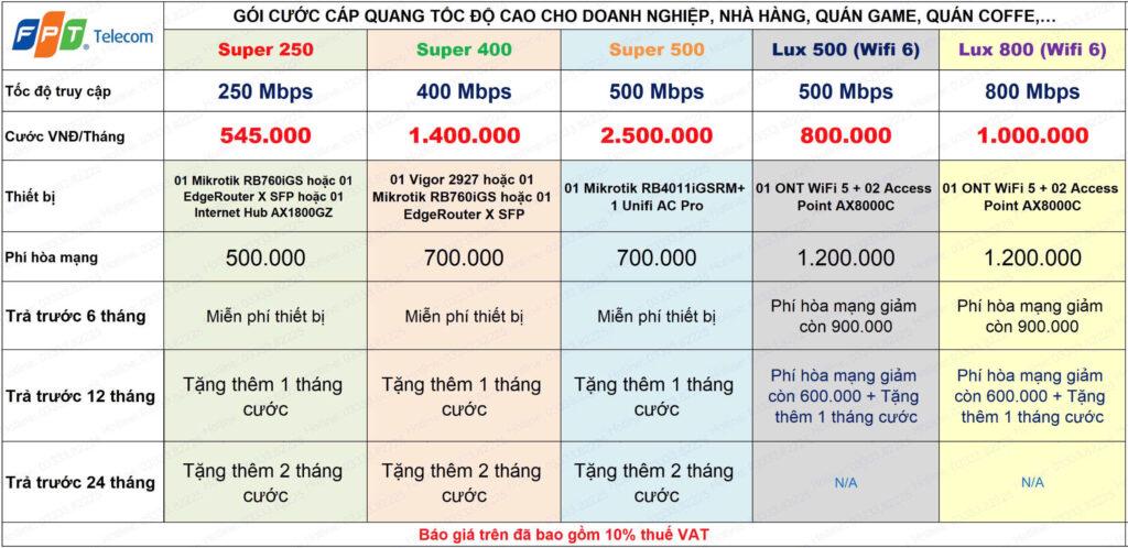 2.3 Bảng giá cap quang dành cho doanh nghiệp, quán game, nhà hàng,…. tại Hà Nội